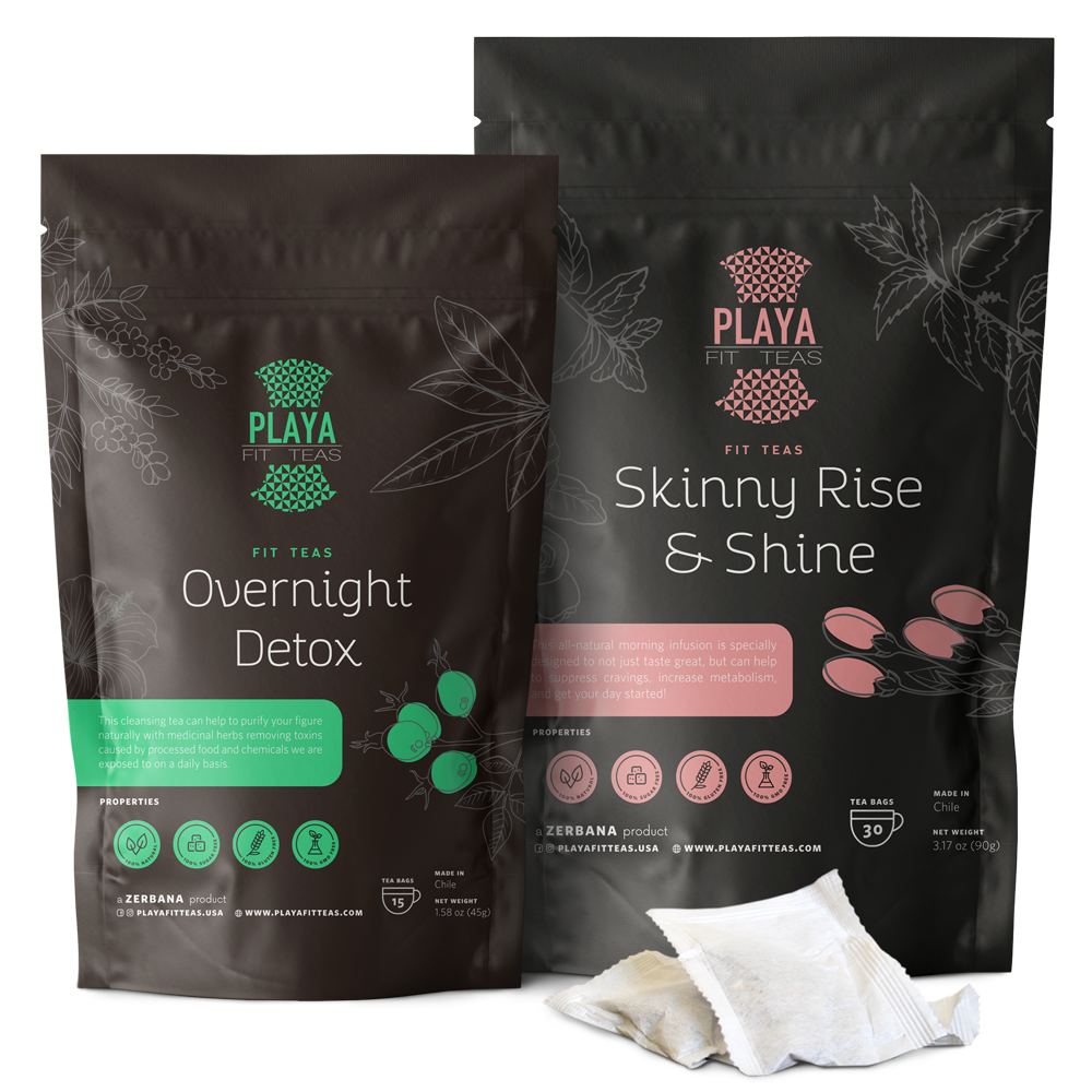El Skinny Rise & Shine (té de mañana, en bolsa rosada) lleva Té Oolong, Yerba Mate, Maqui, Cedrón, Menta, y Jengibre